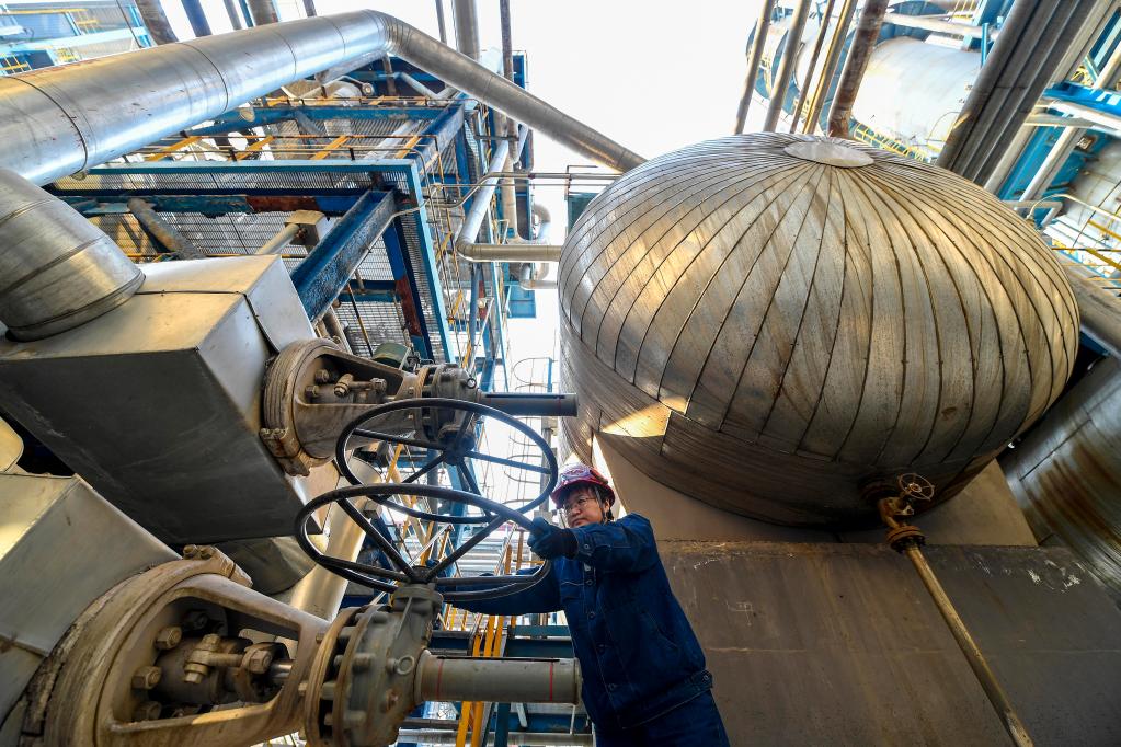 中國石油吉林石化公司煉油廠加氫一車間工人在廠區內進行巡檢。 新華社記者 許暢 攝