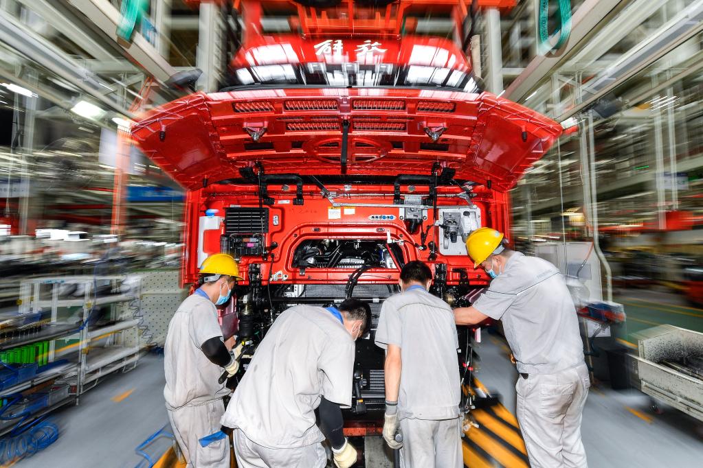 工人在位于吉林長春的一汽解放總裝車間內裝配車輛。 新華社記者 許暢 攝