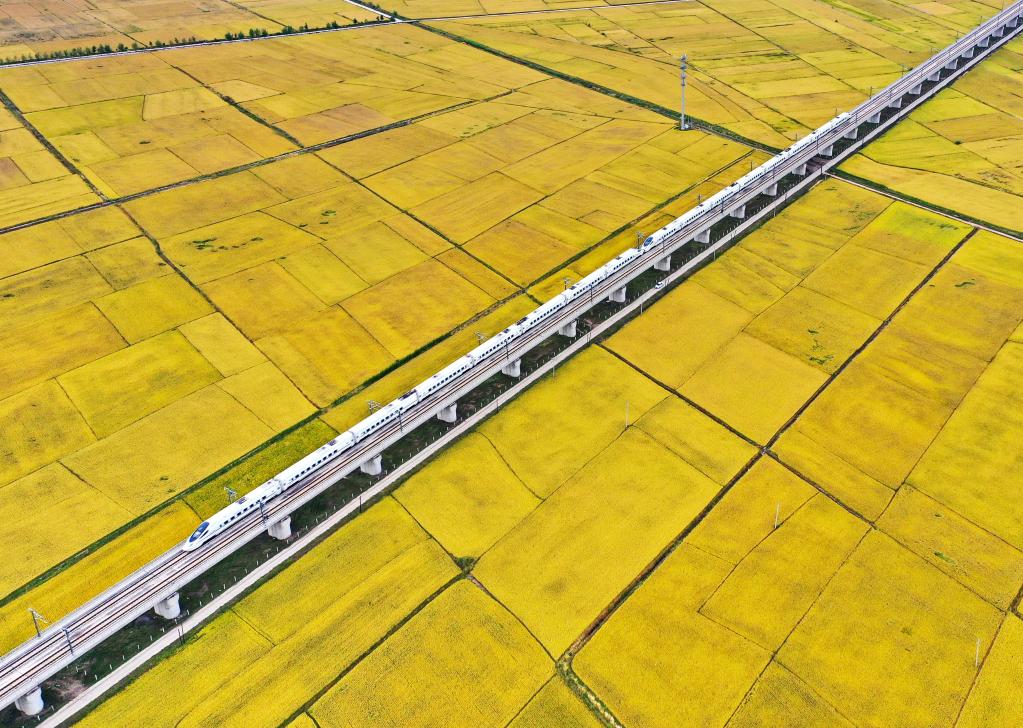 高鐵列車從吉林省公主嶺市沃野間駛過。 新華社記者 張楠 攝
