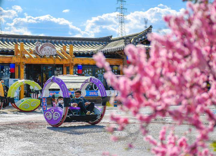 2020年5月6日,在吉林省延邊朝鮮族自治州和龍市西城鎮金達萊民俗村,村民在村內的咖啡館前體驗親子游樂項目。新華社記者 許暢 攝