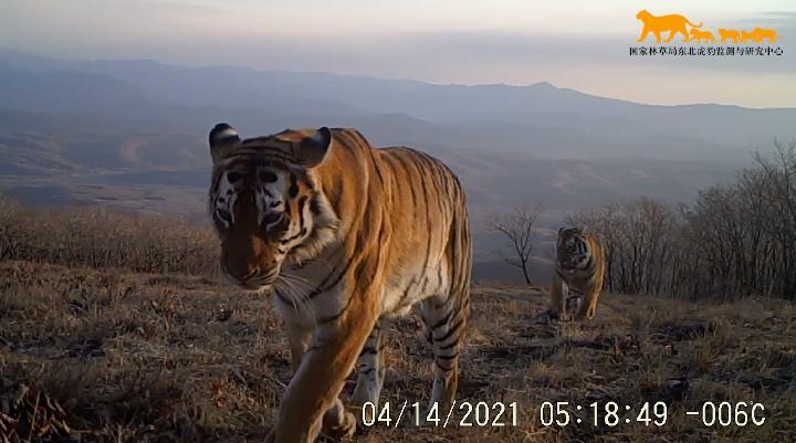 監測畫面中,東北虎正在山中行走(2021年4月14日攝)。新華社發(東北虎豹國家公園管理局供圖)