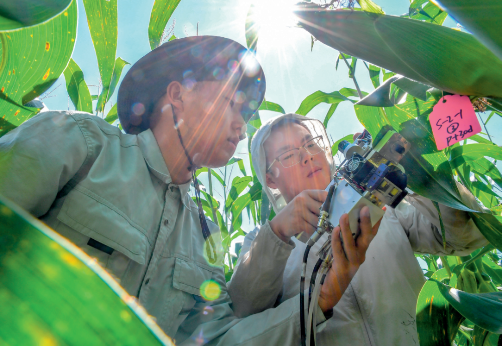在吉林省梨樹縣,中國農業大學在讀博士生沙野(右)和崔帥在試驗田里測量玉米光合作用(2022年8月17日攝) 張楠攝 / 本刊