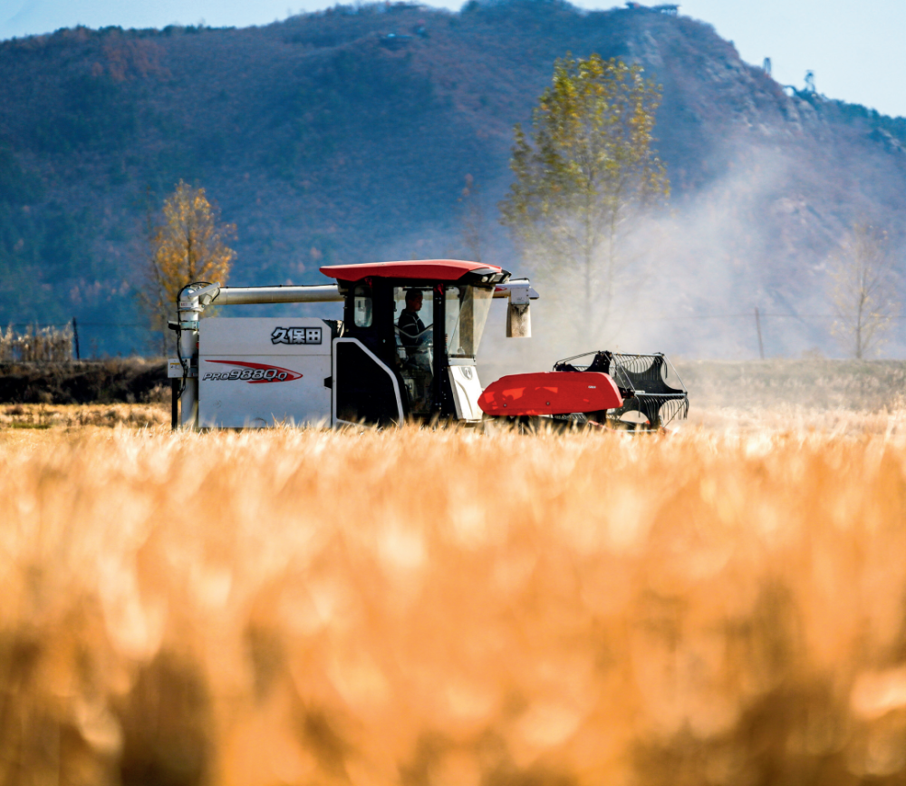 在吉林省延邊朝鮮族自治州和龍市光東村,農民駕駛農機收割水稻(2022年10月23日攝) 顏麟蘊攝 / 本刊