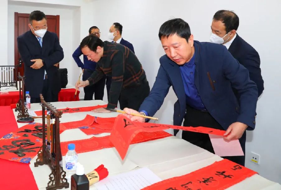 參加“筆墨迎春?情暖軍心”為困難退役軍人送春聯送祝?;顒訂觾x式的書法家們向退役軍人送上新春祝福