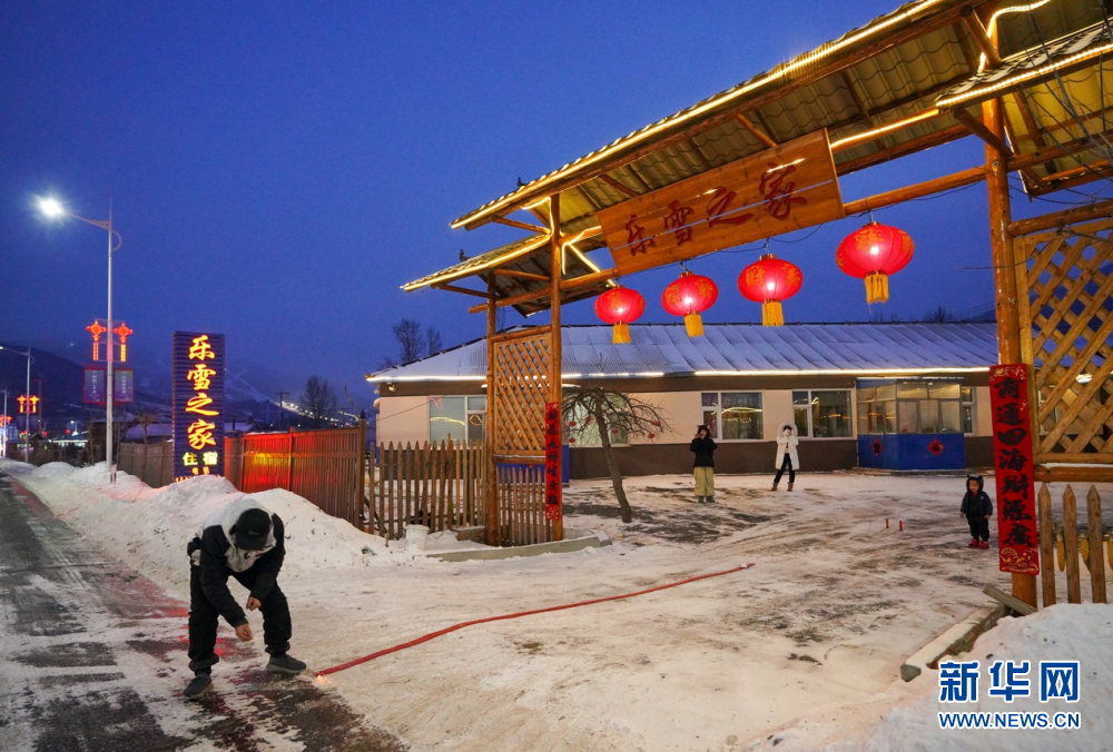 邵鋒和雪友在民宿的院子里與雪友一起放鞭炮。新華社記者 顏麟蘊攝