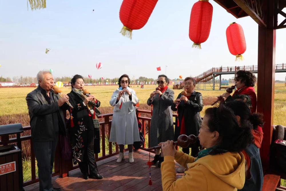 在松原市乾安縣大遐稻語花鄉公園,農民文藝愛好者在吹葫蘆絲。