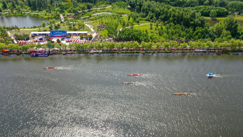 6月22日,在吉林省長春市伊通河工業軌跡公園,眾多市民前來觀看龍舟比賽(無人機拍攝)。 新華社記者 張楠攝