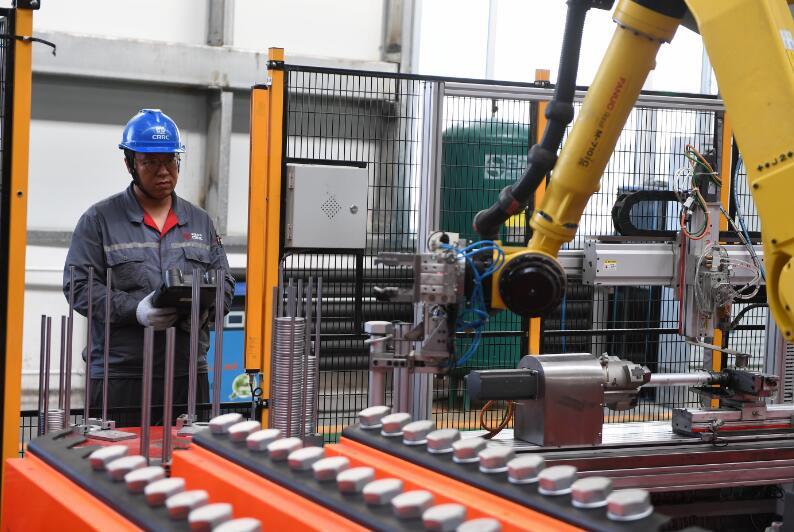 9月26日,在位于吉林松原的吉林中車風電裝備有限公司,工作人員查看機器人工作情況。