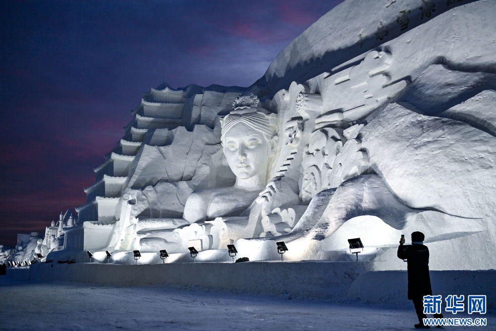 12月12日,游客在長春冰雪新天地的一處雪雕拍照。(新華社記者 顏麟蘊 攝)