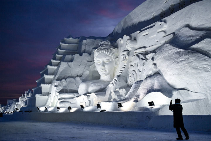 12月12日,游客在長春冰雪新天地一處雪雕前拍照。