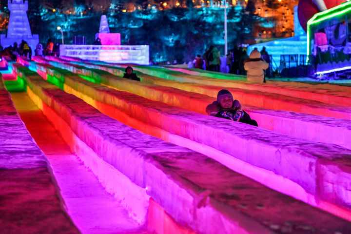 12月12日,游客在長春冰雪新天地體驗冰滑梯。