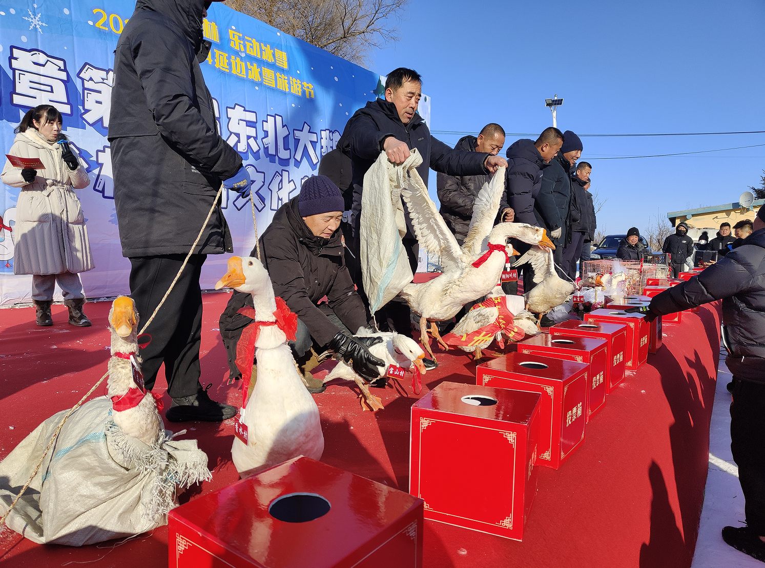 活動現場人頭攢動、熱鬧非凡。游客現場為一只只裝扮討喜的大鵝投票,評選出鵝王并拍賣;大鵝賽跑、大鵝套圈、雪地拔河、雪圈競速等活動引來強勢圍觀;秧歌展演、舞龍舞獅等特色節目讓人感受到了如火熱情;還有雪人矩陣、可愛小鹿等都是人們紛紛拍照的熱門打卡點。大鵝美食節自然也少不了美食,現場架起了三口大鐵鍋,分別準備了酸菜燉大鵝、小雞燉蘑菇、豬肉燉粉條供游客免費品嘗。更有黨支部領辦合作社特色農產品展銷,貨真價實,物美價廉。