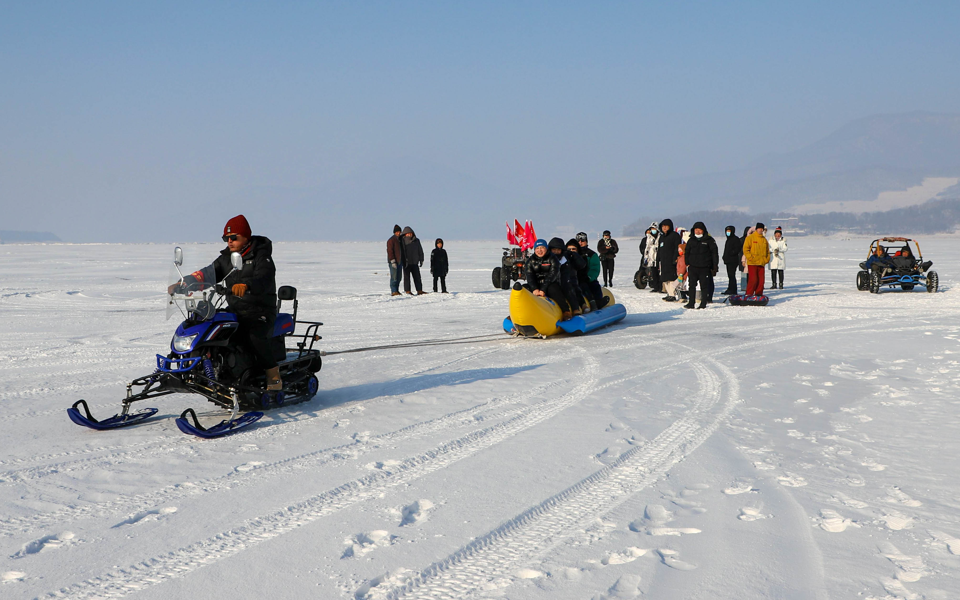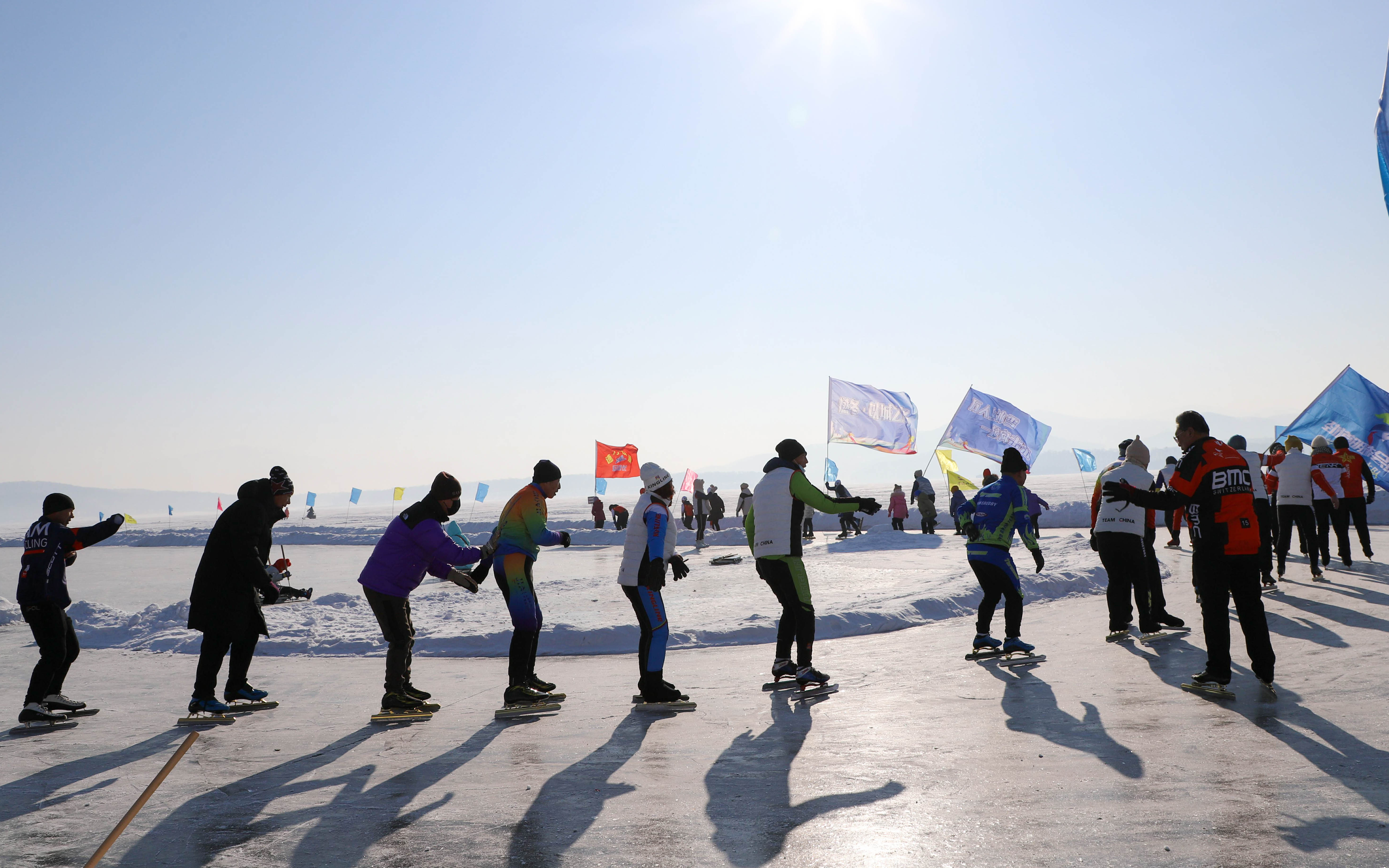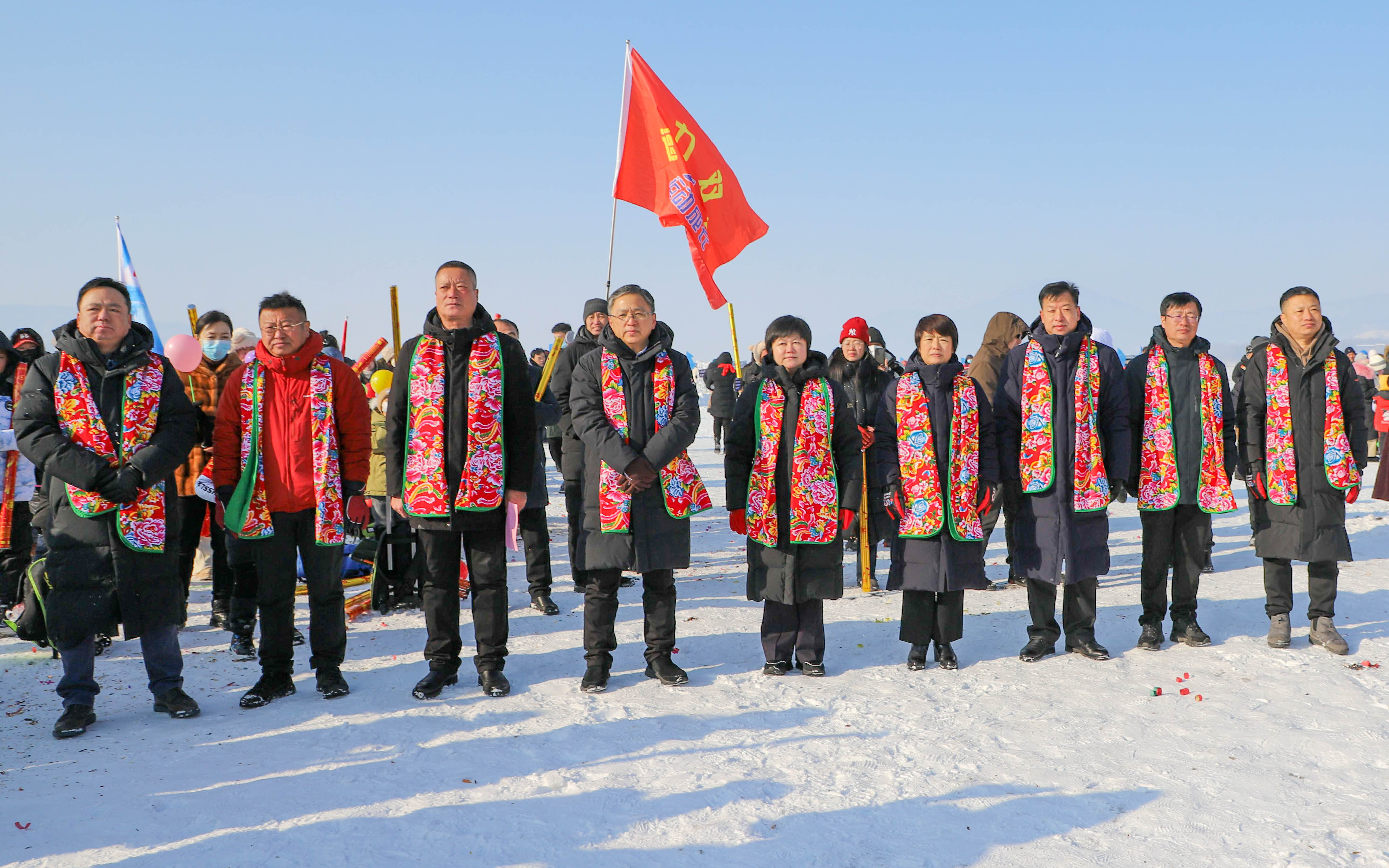 當日,活動現場用冰塊打造的船型舞臺美輪美奐。冰封的湖面上,打雪仗、滑雪圈、駕駛冰車,人們在暢快淋漓中盡情陶醉;活力四射健身操,在冰面上掠過的滑冰愛好者宛如幻影,將現場氣氛不斷推向高潮?,F場游客伴隨著動感的旋律,在冰天雪地里盡情舞動,肆意揮灑豪邁激情。