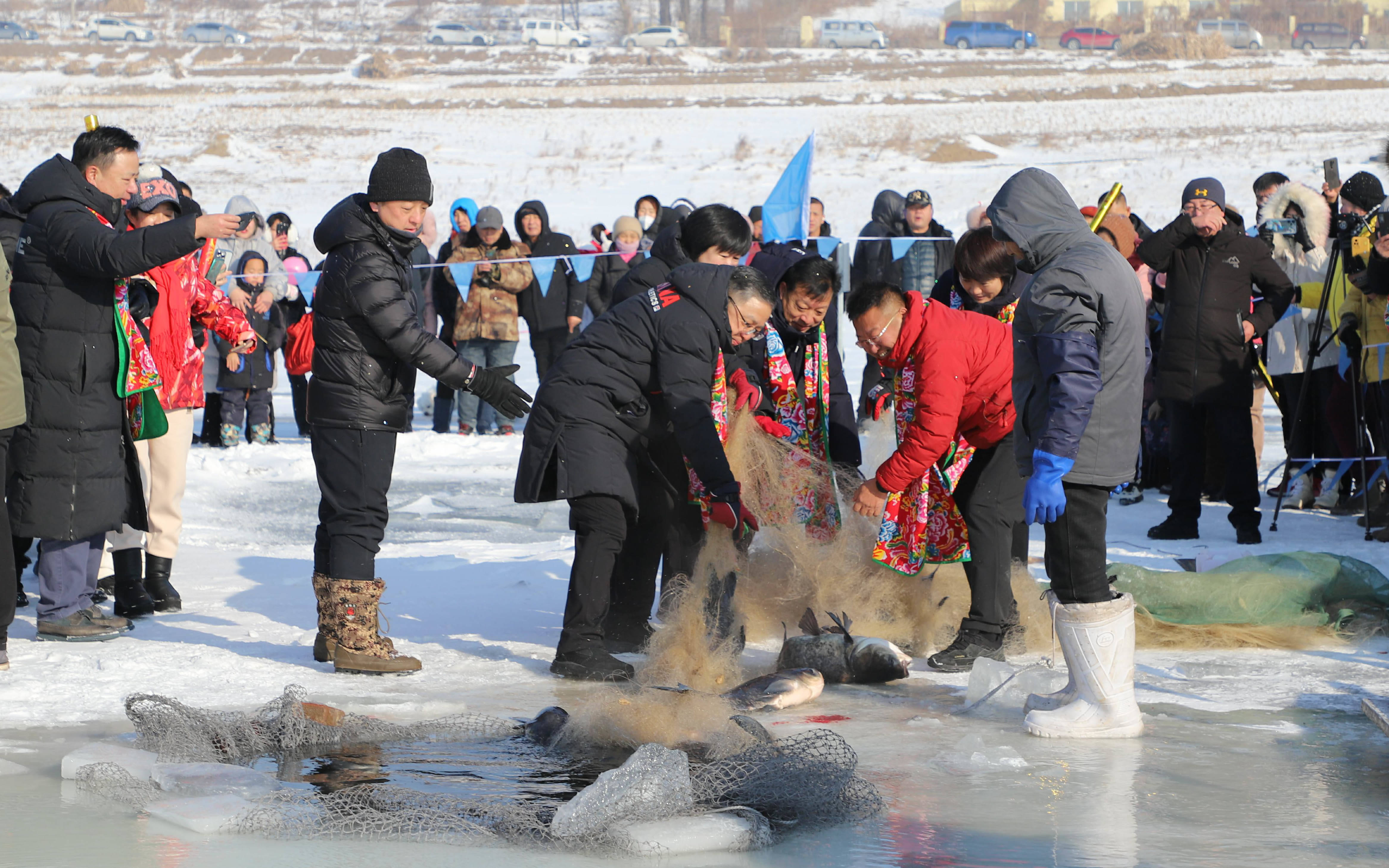 起網,是最為激動人心的時刻,在人們的歡呼聲中,大網從冰洞中漸漸滑出,猶如行進在冰面上的一條傳送帶。霎時間,伴隨著水汽,數不清的胖頭魚、草魚、鯉魚、鰲花魚……源源不斷地從冰下輸送出來,在冰面上翻滾著、跳躍著,煞是喜人。高空鳥瞰,魚騰冰湖,構成了冰天雪地里一幅絕美的畫卷。