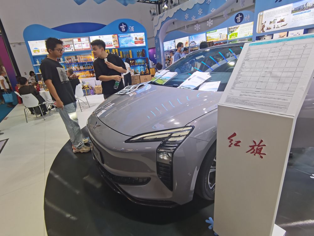 造型時尚的紅旗EH7新能源汽車是吉林展區的焦點之一。