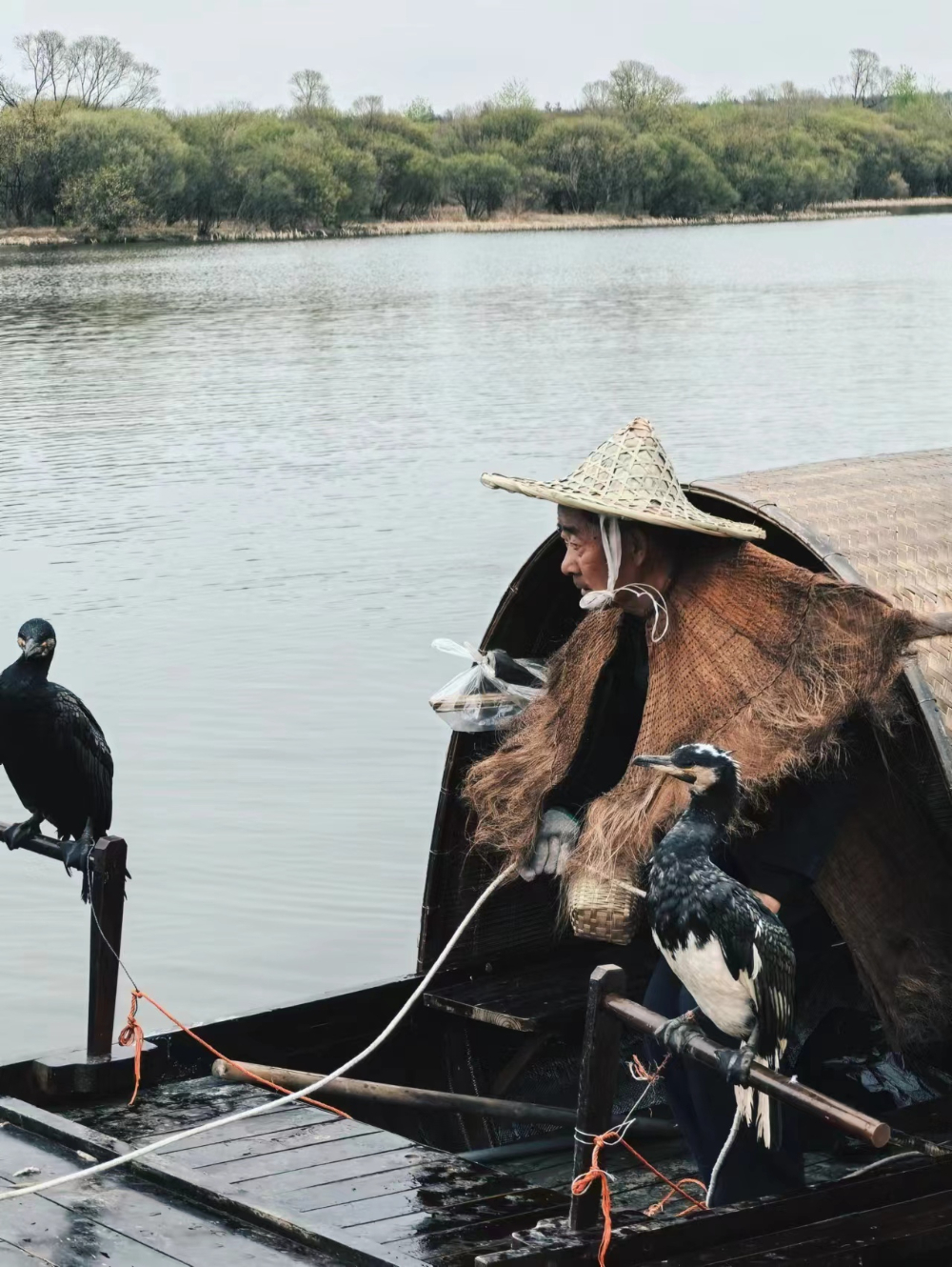 3、觀看非遺鸕鶿捕魚表演:漁翁手持長竿,竹筏上幾只魚鷹昂首挺立,它們的眼睛炯炯有神,仿佛已經鎖定了水下的獵物。