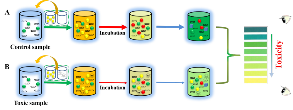 “這種檢測方法類似于用pH試紙檢測酸堿度,通過肉眼顏色比對就可以實現水質毒性的便捷檢測。當水樣無毒,會呈現綠色,而當水樣有毒,則會呈現黃色,顏色越黃毒性越大?!庇嗟潜蠼榻B,該成果具有操作簡單、成本低廉、檢測結果可視化等優點,有望為發展新型比色檢測試劑盒及相關儀器提供核心技術支撐,并在飲用水毒性檢測、生態毒性檢測、危險廢物檢測等領域發揮作用。