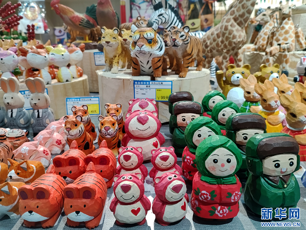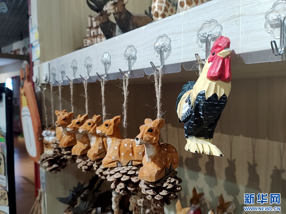 憨態可掬的小老虎,嘴角上揚的小熊,呆萌的小兔子,伏于松塔上的梅花鹿……木雕玩偶和掛件吸引了游客們的目光,“玩偶是用長白山椴樹雕刻的,掛件是椴樹和松塔組合而成,椴樹木質很軟,易于雕刻,這些玩偶和掛件,不僅我國小朋友喜歡,韓國小朋友也特別喜歡,每次韓國旅游團來,都會買走不少呢?!笔圬泦T說,最近,樺樹皮制成的冰箱貼和發卡賣得也很火。