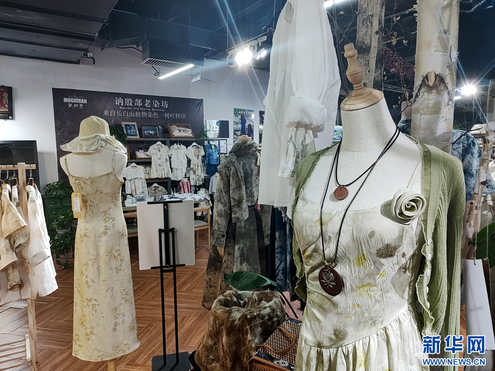 旗艦店內顏色各異、款式不同的服裝、帽子和圍巾等,引人駐足。顏色柔和自然,工藝獨特環保,一些衣物上還掛著其染色所取植物的標牌,長白山核桃樹、紫花槭、藍靛果、五味子等,通過獨特的植物轉印染色,將植物的顏色和脈絡,清晰地展現在布面上,詮釋樹葉之美,展示脈絡之奇,呈現自然用色,留住草木記憶。