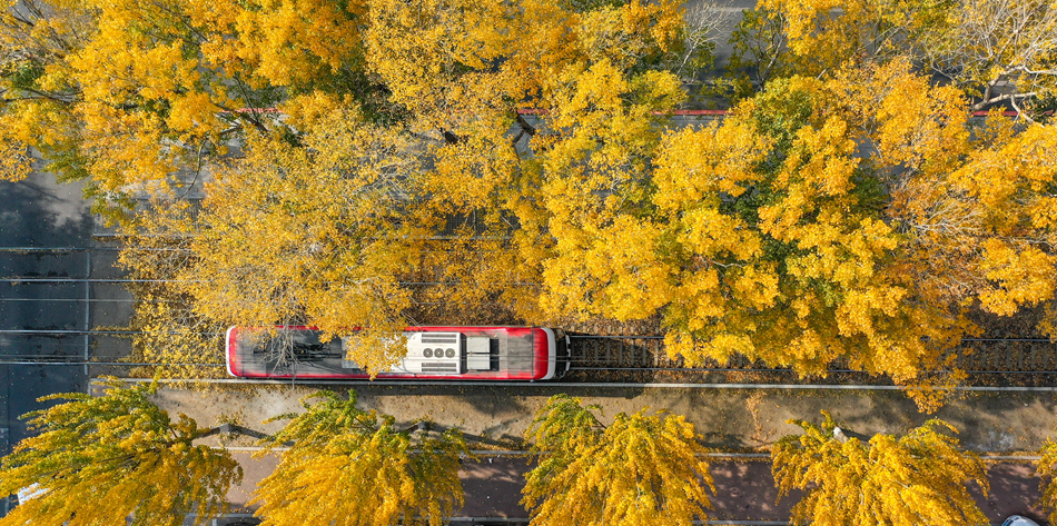 2023年10月24日,一輛電車行駛在長春市春城大街(無人機照片)。新華社記者 張楠 攝