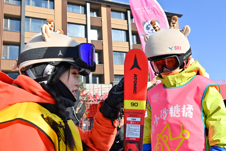 1月8日,滑雪教練在吉林市萬科松花湖度假區向來自廣西南寧的“砂糖橘”小朋友講解滑雪知識。新華社記者 顏麟蘊 攝