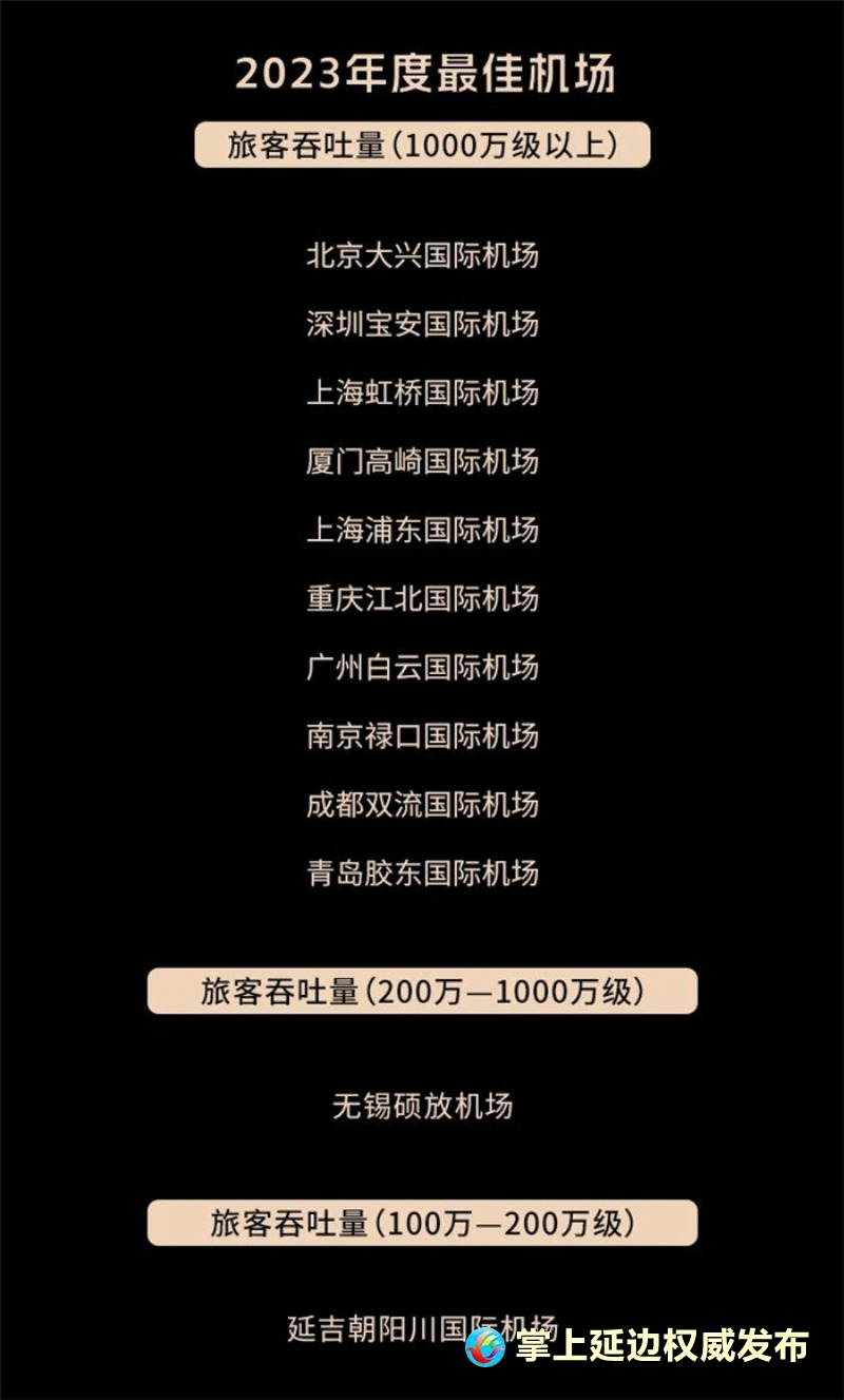 6月14日,由CAPSE(民航旅客服務測評)主辦、杭州機場協辦的2024CAPSE年度峰會在杭州舉辦,會上公布了第十屆CAPSE航空服務獎榜單。延吉朝陽川國際機場榮獲2023年度最佳機場(100萬-200萬級),為該量級唯一獲獎機場。