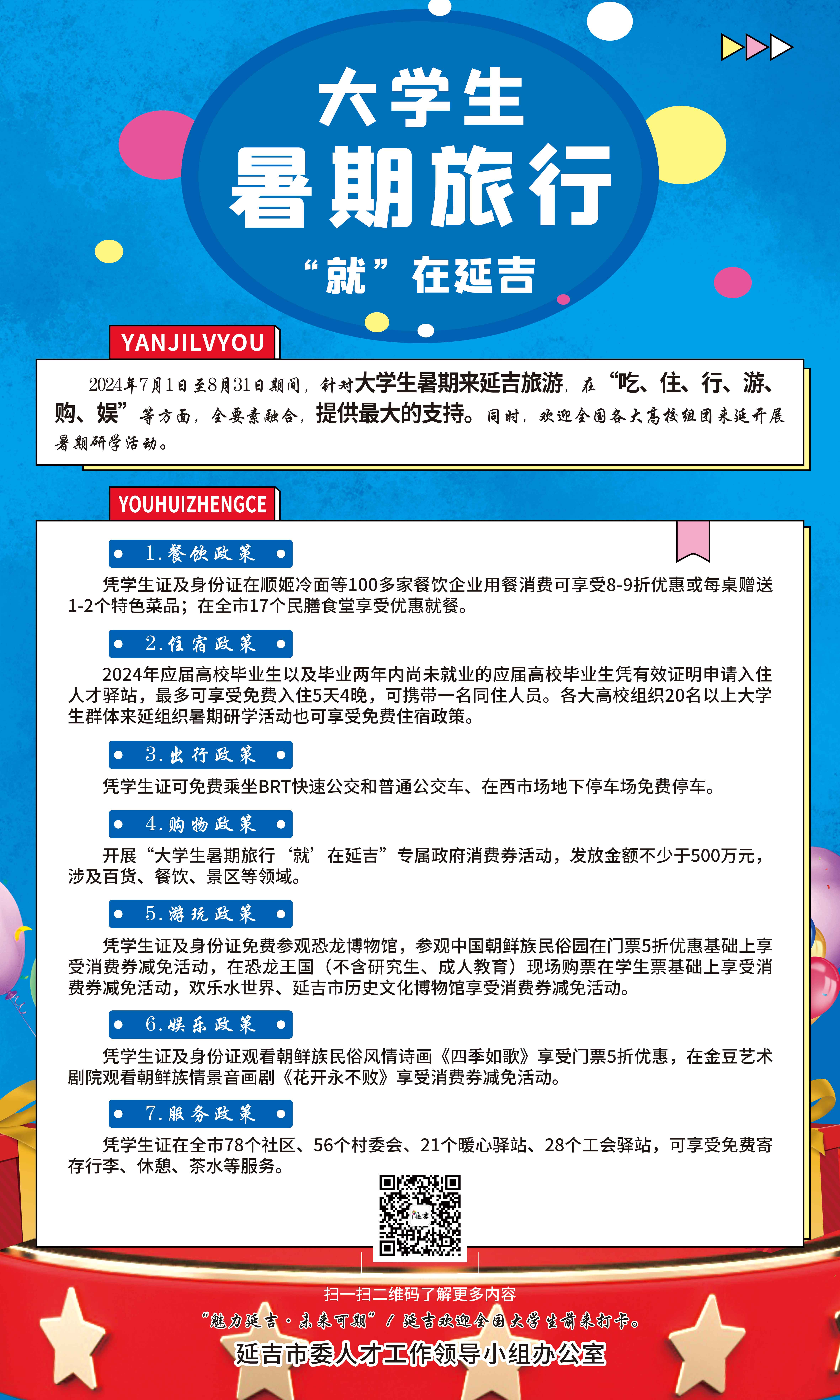 今年暑期,延吉市升級完善了大學生暑期活動“吃、住、行、游、購、娛”等方面政策,力求打造全方位、立體化的政策服務矩陣,持續吸引全國大學生到延吉就業旅游,讓他們把延吉作為擇業就業起步之地、事業發展啟航之地、夢想追求起飛之地,為延吉高質量發展提供有力人才支撐。