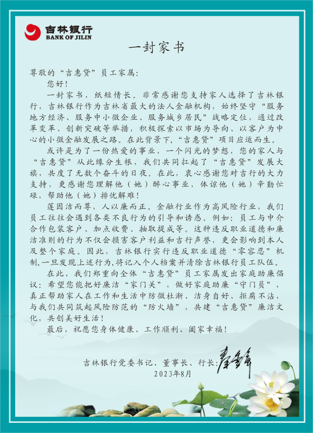 該業務上線以來,吉林銀行連續開展“廉潔家書”活動,并制定《“吉惠貸”客戶經理“十禁令”》,架設道德風險防范“高壓線”。上線“拒絕與中介合作聲明”與《廉潔從業告知書》,全渠道告知客戶吉林銀行不收取除利息外任何額外費用,并由客戶簽字確認,打造陽光信貸服務理念。由董事長秦季章親筆簽名的“廉潔家書”活動已累計送達客戶經理家屬62戶。