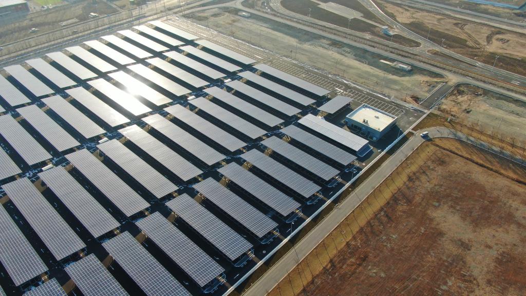 這是在遼寧省沈陽市的華晨寶馬鐵西新工廠拍攝的光伏發電設施(無人機照片)。新華社記者 楊青 攝