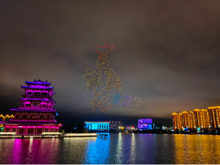 尤為震撼的是,千架無人機在夜幕中騰空而起,以夜空為幕,通過精準的編隊和絢麗的燈光變化,呈現出一系列美輪美奐的圖案和文字表演,展示出敦化獨特的地域文化和城市魅力。一幅幅絢麗多彩的畫面,宛如一場奇幻的光影盛宴?!凹槎鼗瘹g迎您”向喜歡敦化的朋友們傳遞著敦化的友好與包容,“全民健身 全民健康”倡導全民積極參與健身、健康活動,“中華民族一家親,同心共筑中國夢”表達了敦化人民對民族團結和國家繁榮的堅定信念,“中國優秀旅游城市”彰顯了敦化作為旅游勝地的獨特魅力和吸引力,“我們如此熱愛敦化”直抒胸臆地表達了敦化人民對家鄉的深厚情感和自豪之情,這份熱愛將激勵著大家為敦化的美好未來不懈奮斗。