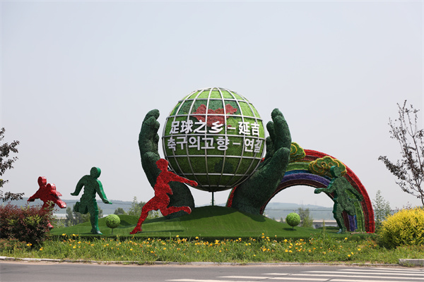 在延吉西出口,過往游客可看到以足球運動為核心元素的標志性景觀造型,展現了延邊人民對足球的熱愛。人行步道起點和沿線設置了醒目的“延吉歡迎您”景觀小品、革命老區標識小品以及獨具足球之鄉特色的文化小品,充分展示了“活力延吉”的設計理念?!岸颊f延邊是足球之鄉,這次一到延吉就感受到了,看得出延邊人是真愛足球啊,就連綠化都跟足球有關系!”從黑龍江自駕到延邊的李先生在西出口休息區休息的時候,帶著愛人和父母邊欣賞造型鮮明的綠化景觀,邊頗有感觸地贊嘆。