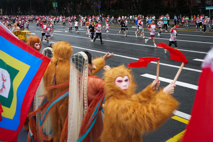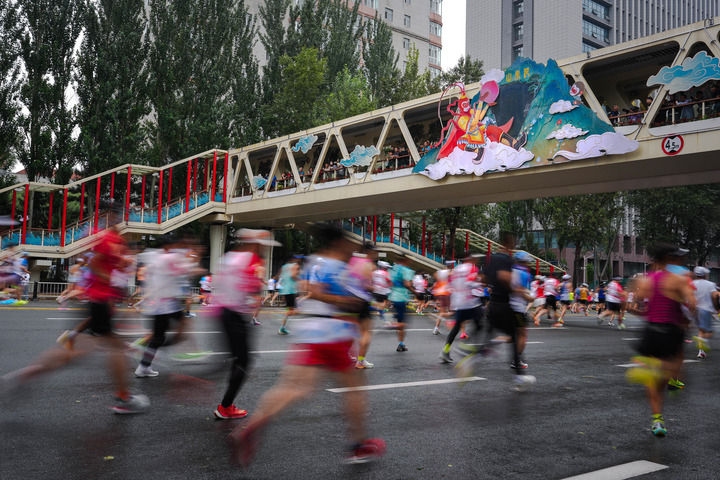 9月1日,長春市動植物公園西游記主題游園活動的演職人員為途經的參賽選手吶喊助威。
