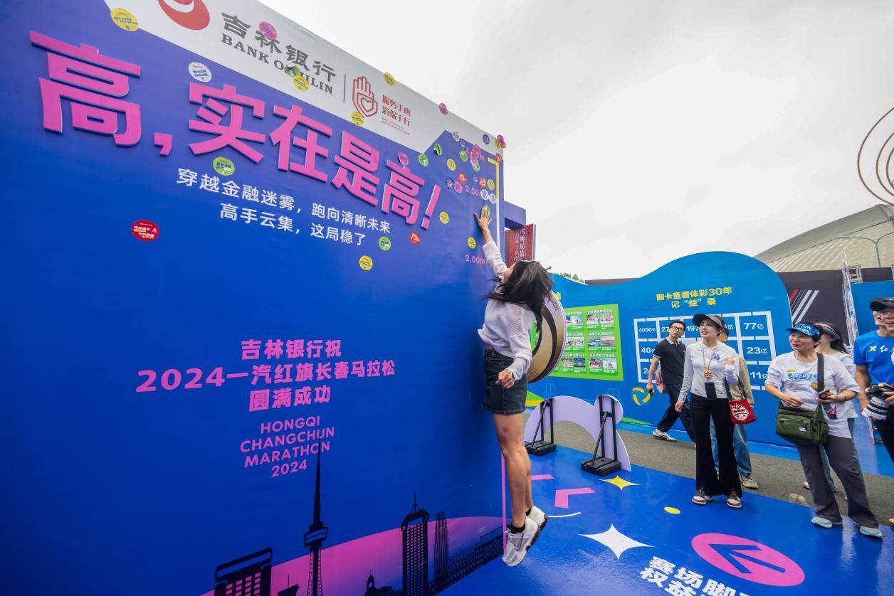 長馬賽事期間,吉林銀行將金融知識巧妙地融入到體育運動之中,通過跳格子游戲,向參賽選手及觀展游客開展投資者教育,提高風險防范能力;現場的頸椎視力表不僅僅能檢測視力,還可以讓人了解金融消費者八項基本權益;“話里有話”互動區,一翻一看之間就能了解“刷單返利、貪外有貪”等騙局,使廣大觀展游客精準識破金融騙局中的謊言;摸高墻記錄高度的貼紙上是一句句金融知識,寓意將金融消費者的風險防范意識一起提升至最高處……