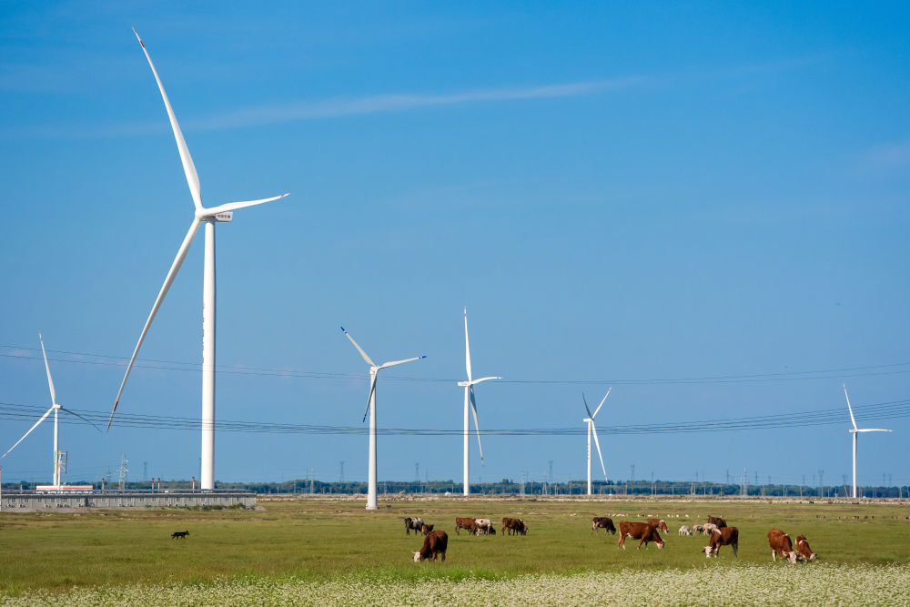 8月28日,一只飛鳥在吉林油田55萬千瓦風電項目的風機間飛過。新華社記者 許暢 攝