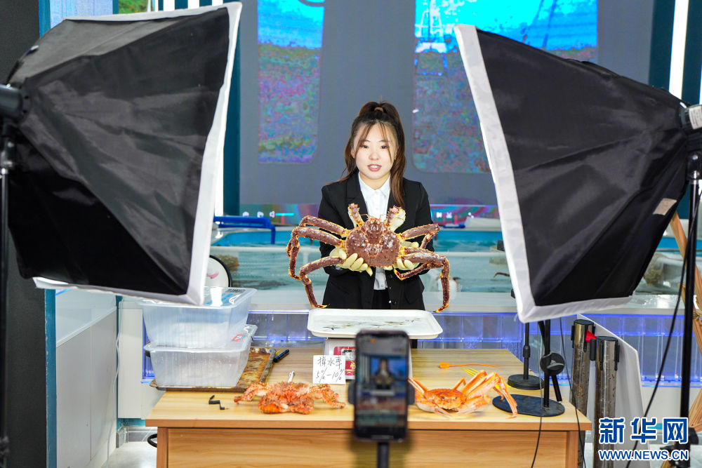 在琿春帝王蟹保稅店內,工作人員進行網絡直播售賣帝王蟹。