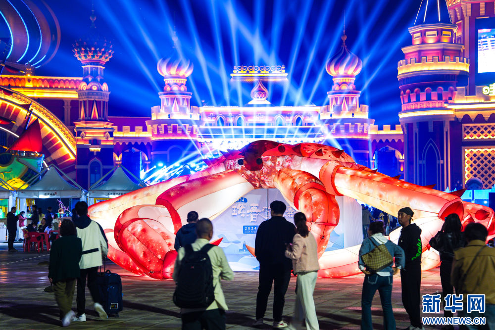 游客在吉林省琿春市的2024琿春帝王蟹美食嘉年華現場游玩。