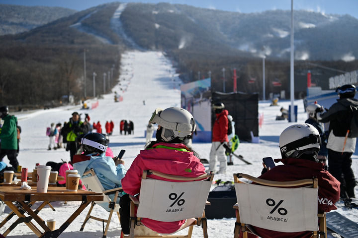 11月23日,滑雪愛好者在吉林市北大湖滑雪度假區的休息區喝咖啡。