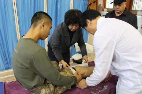 在義診活動現場,圖們市退役軍人企業延邊山寶發展科技有限公司醫療隊為部隊官兵把脈問診,詳細詢問官兵病史和身體健康情況,進行答疑解惑。同時,結合官兵日常訓練中經常遇到的關節損傷肌肉扭傷、運動性外傷等問題,醫療隊幫助官兵進行針對性治療并傳授簡單有效的預防保健知識。