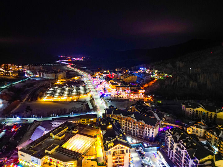 這是12月19日拍攝的吉林市北大湖滑雪度假區商業街夜景(無人機拍攝)。