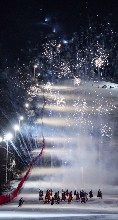 12月19日,表演者在第二屆世界寒地冰雪經濟大會進行夜滑表演。