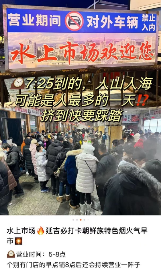 大眾點評上,許多網友把水上市場列為“延吉必打卡”項目,并發布各種早點攤排隊攻略。進入嚴冬,早市內卻熱火朝天。許多小吃攤排起長隊,人參、明太魚等特色農副產品攤位也頗受歡迎。