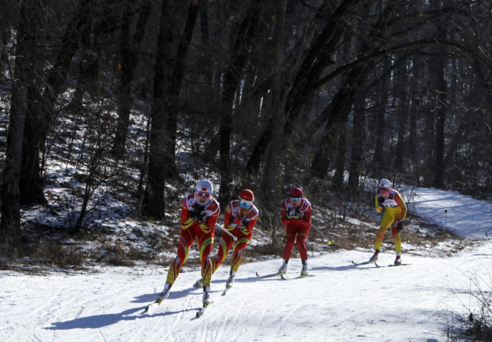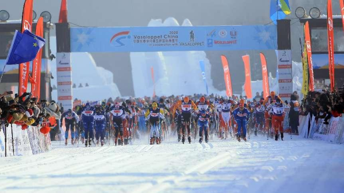 2020年1月4日,參賽選手在比賽中出發。當日,2020中國長春凈月潭瓦薩國際滑雪節暨2020國際雪聯越野滑雪中國巡回賽長春站比賽在長春舉行,吸引來自30多個國家和地區的千余名選手參賽。新華社記者 雒圓 攝