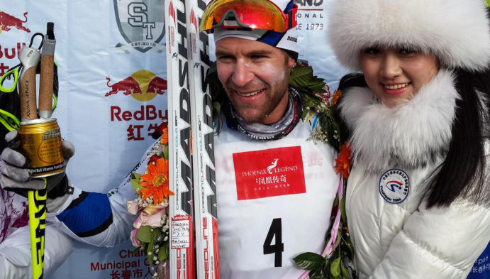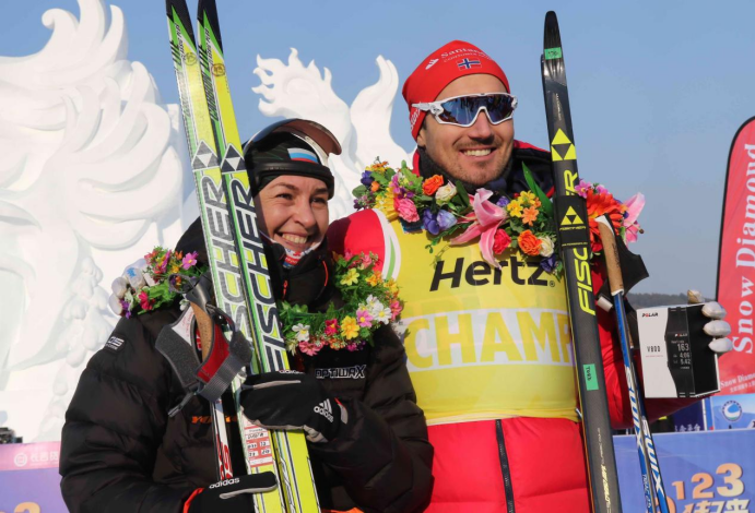 2017年1月4日,俄羅斯選手奧爾加(左)賽后與男子組冠軍挪威選手安德烈亞斯合影。當日,2017中國長春凈月潭瓦薩國際越野滑雪節暨國際雪聯50公里積分賽在長春舉行。新華社記者 林宏 攝
