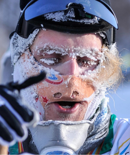 2013年1月2日,一名選手的面部被冰霜“包裹”。當日,2013中國長春凈月潭瓦薩國際滑雪節在長春舉行,零下20多度的低溫和大運動量的消耗使選手們的汗水在面部布上了一層特殊的“霜凍面具”,這也從側面印證了比賽之艱苦。新華社記者 王昊飛 攝