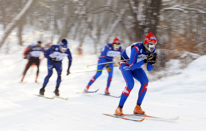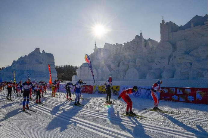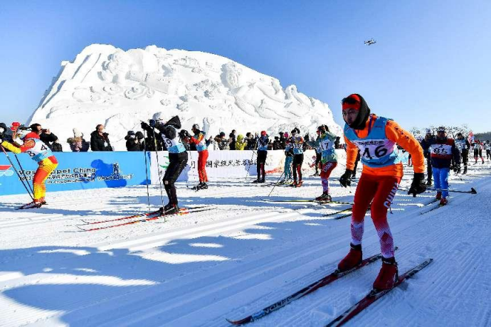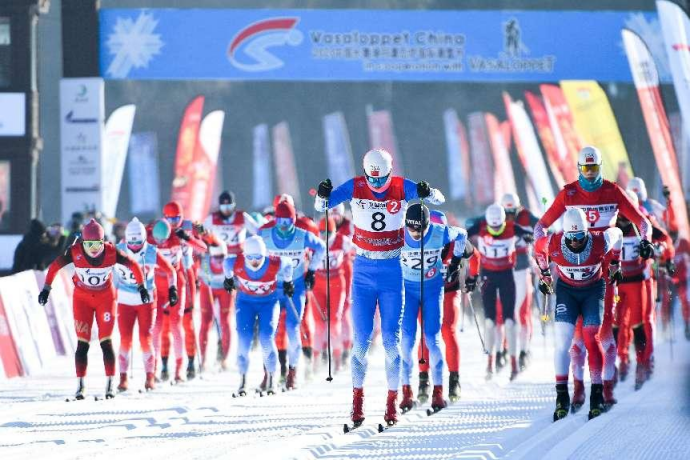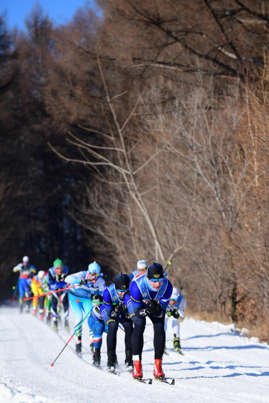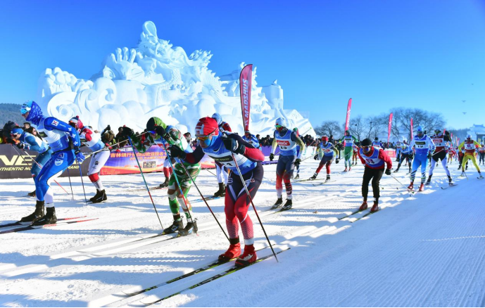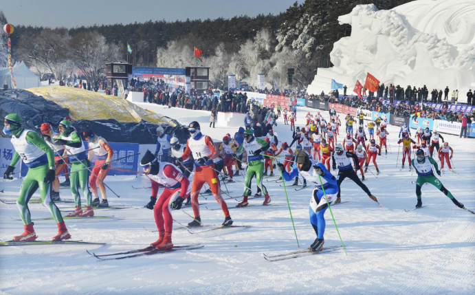 2023年1月4日,參賽選手在比賽中出發。當日,第21屆中國長春凈月潭瓦薩國際滑雪節在吉林省長春市拉開帷幕,330余名中外選手參賽,共同感受越野滑雪運動帶來的快樂。新華社記者 許暢 攝