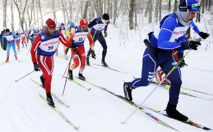 2013年1月2日,選手們在比賽中出發。當日,2013中國長春凈月潭瓦薩國際滑雪節暨國際雪聯長距離積分賽在長春市凈月潭國家森林公園舉行,來自32個國家和地區的萬余名選手參加了比賽。新華社記者 徐家軍 攝