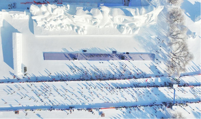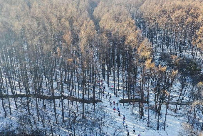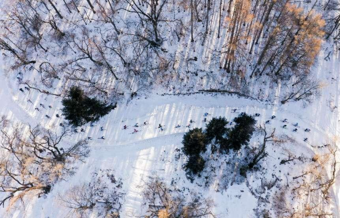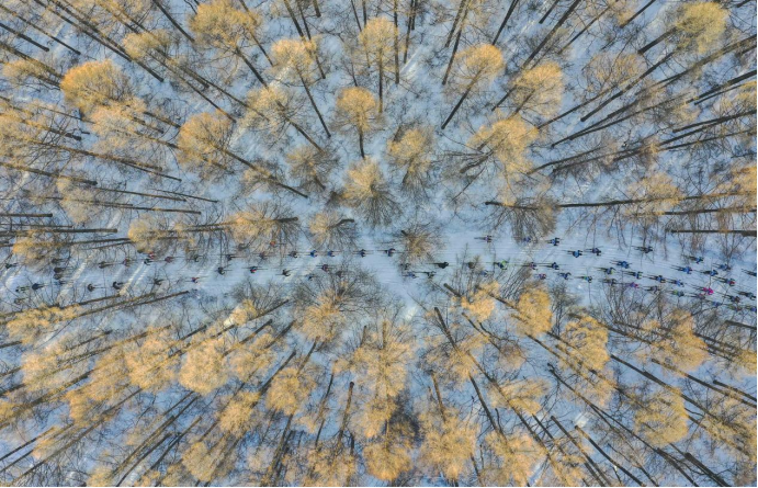 2023年1月4日,參賽選手在比賽中(無人機照片)。當日,第21屆中國長春凈月潭瓦薩國際滑雪節在吉林省長春市拉開帷幕,330余名中外選手參賽,共同感受越野滑雪運動帶來的快樂。新華社記者 許暢 攝