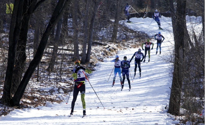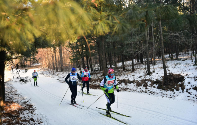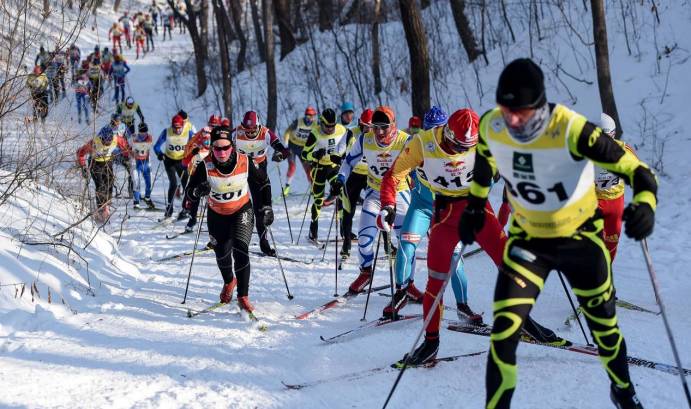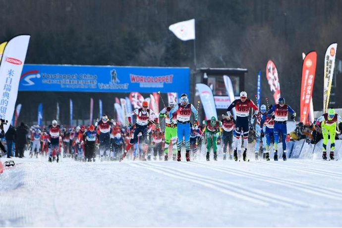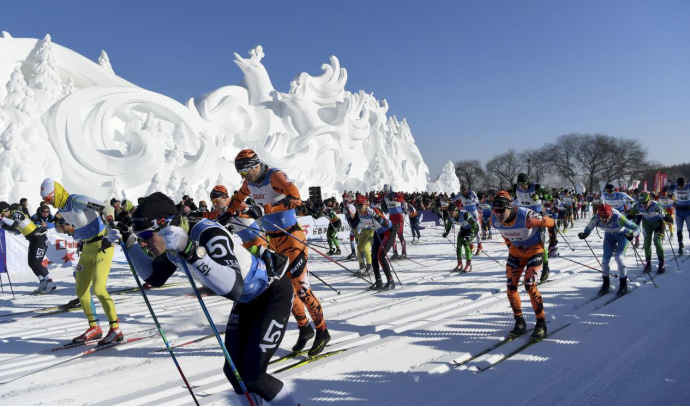 2017年1月4日,參賽選手從起點出發。當日,2017中國長春凈月潭瓦薩國際越野滑雪節暨國際雪聯50公里積分賽在長春舉行,來自30多個國家和地區的1000余位專業選手參賽。新華社記者 林宏 攝