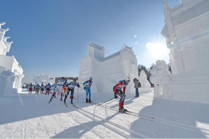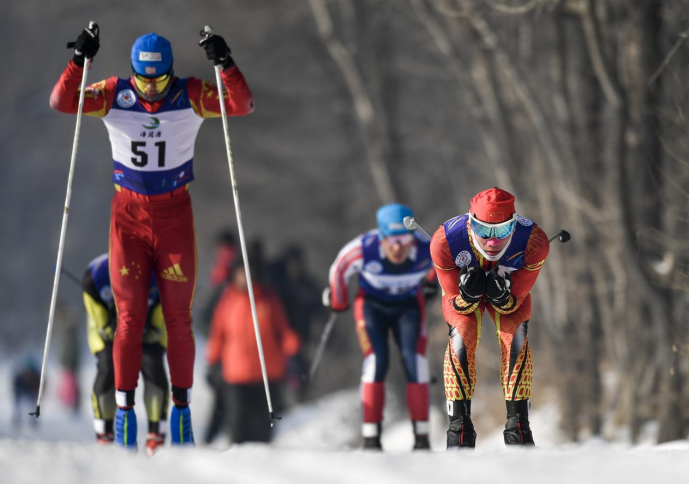 2019年1月4日,參賽選手在比賽中。當日,2019中國長春凈月潭瓦薩國際滑雪節暨國際雪聯越野滑雪中國巡回賽長春站比賽在長春市舉行,吸引了來自32個國家和地區的1000余名選手參賽。新華社記者 孫瑋彤 攝