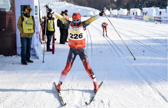 2015年1月2日,中國選手李宏雪沖過終點后慶祝。當日,在2015中國長春凈月潭瓦薩國際越野滑雪節暨國際雪聯50公里長距離積分賽中,中國選手李宏雪以2小時42分16秒3的成績奪得女子組冠軍。新華社記者 王昊飛 攝